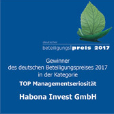 Im Rahmen der Verleihung des deutschen BeteiligungsPreises 2017 wurde Habona Invest, der Spezialist für Nahversorgungsimmobilien, in der Kategorie "TOP Managementseriosität" ausgezeichnet.