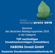Habona gewinnt erneut den deutschen BeteiligungsPreis. Der Spezialist für Nahversorgungsimmobilien wurde in der Kategorie "TOP nachhaltiges Investmentvermögen (Immobilien)" mit dem Deutschen Beteiligungspreis 2018 ausgezeichnet.
