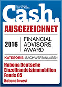 Sieger in der Kategorie „Sachwertanlagen AIF“: Habona freut sich über eine ganz besondere Auszeichnung. Der Cash. Financial Advisors Award 2016 in der Kategorie “Sachwertanlagen/AIF” geht an den Habona Einzelhandelsfonds 05. Die Jury des Fachmagazins Cash. hat den Fonds anhand der Kriterien „Innovation“, „Transparenz“, „Anlegerfreundlichkeit“ und „Vermittlerorientierung“ prämiert.